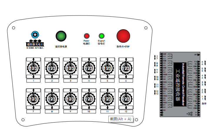 12個三位自復位撥桿(可更換為三位自鎖保持撥桿),每個撥桿均為前中后3個位置,前推或后推,松開后則自動回到中間零位,每個撥桿均可單獨控制一個電機正反轉或類似上升下降或伸縮縮回此類正反向動作12組,每個撥桿對應接收器端2路開關量,12個合計對應接收器端24路開關量信號輸出。