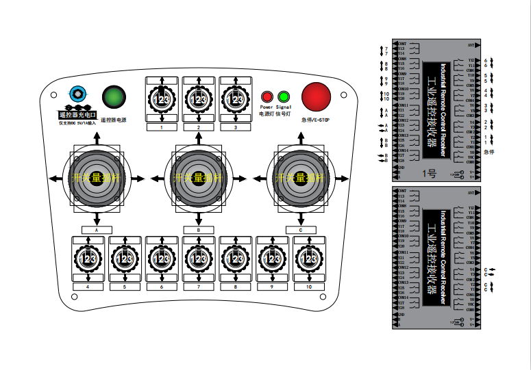 布局配置:3個(gè)四方向開關(guān)量自復(fù)位搖桿,12個(gè)三位自復(fù)位撥桿, 2個(gè)指示燈,充電孔,及啟動(dòng)和急停蘑菇頭;